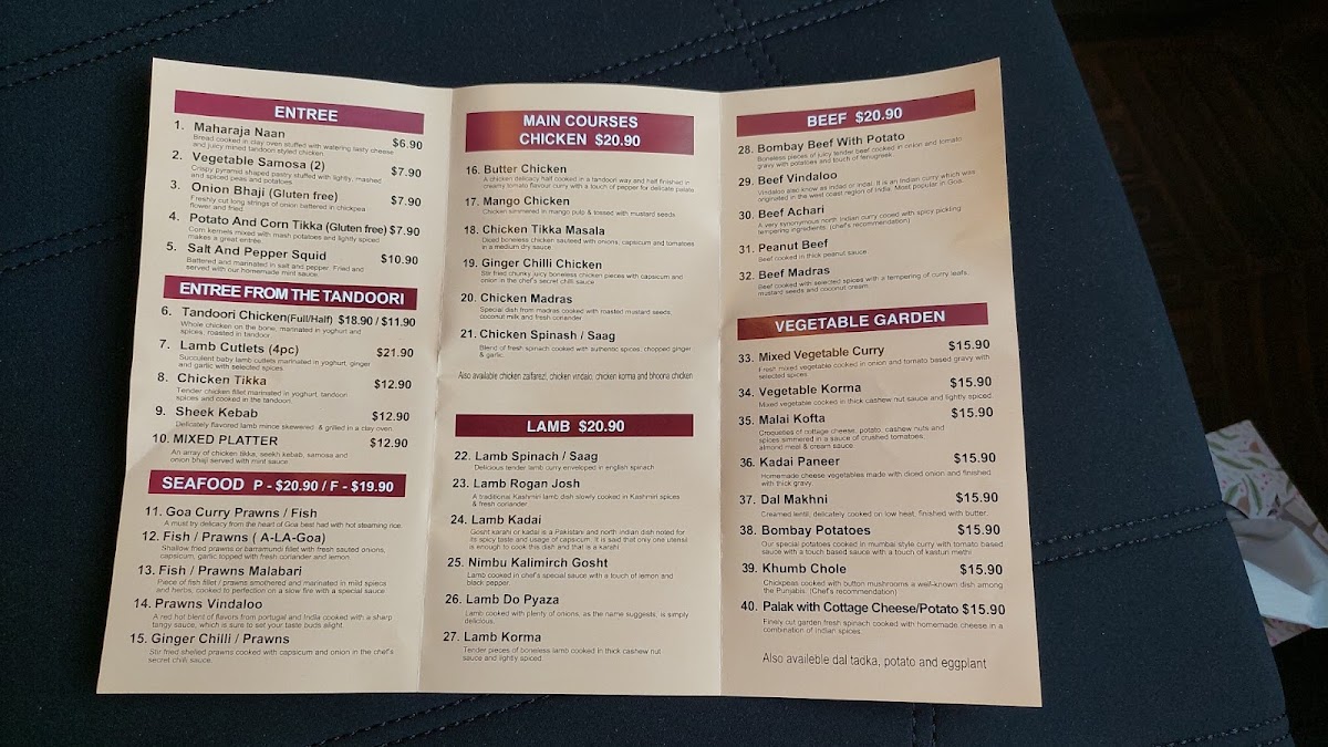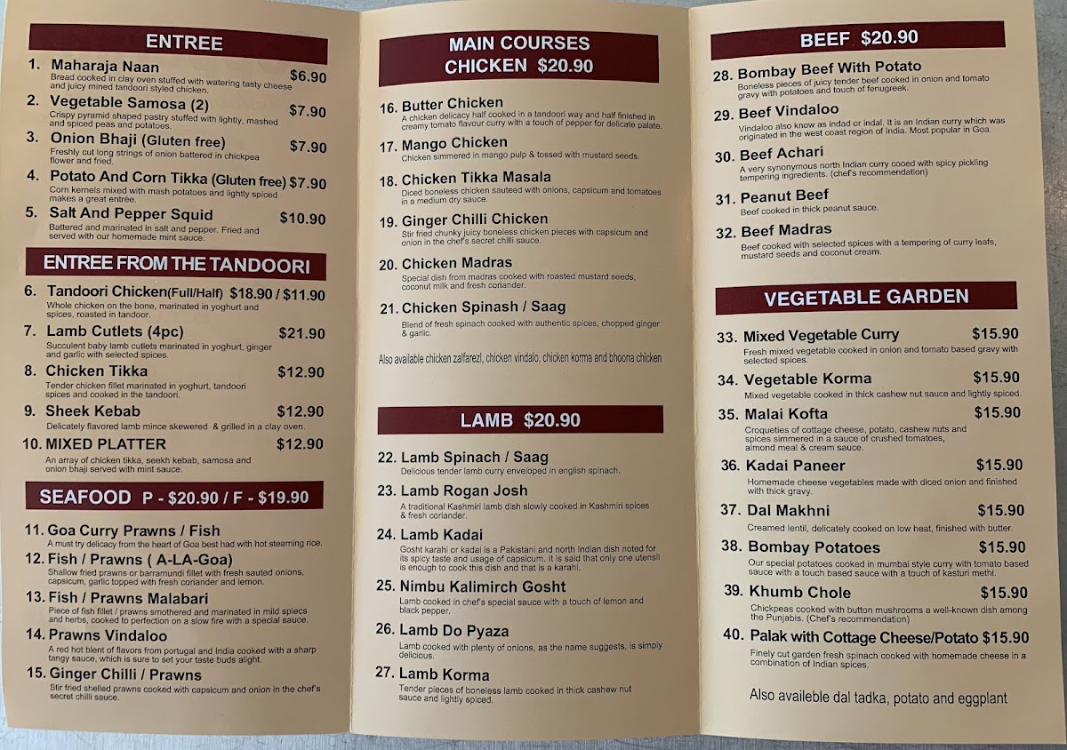 Vegetarian diners are well catered for in the Vegetarian Garden, featuring comforting and flavourful dishes such as Dal Tadka - Vegetable Garden, Dal Makhani, Bombay Potatoes, Palak With Cottage Cheese Or Potato, and Potato & Eggplant - Vegetable Garden. The heart of the menu lies in its rich curries, with Main Course - Chicken options like Chicken Tikka Masala, Chicken Vindaloo, Mango Chicken, Bhuna Chicken, and Chicken Korma, alongside equally robust Main Course - Lamb dishes including Lamb Rogan Josh, Lamb Korma, Lamb Do Pyaza, Lamb Kadai, and Nimbu Kali Mirch Gosht. For those who enjoy beef, the Main Course - Beef range stands out with Beef Achari, Peanut Beef, Bombay Beef With Potato, Beef Vindaloo, and Beef Madras, while the Seafood section brings coastal flair through Prawns Vindaloo, Malabari, Goa Curry A-La-Goa, and Ginger Chilli & Prawns.