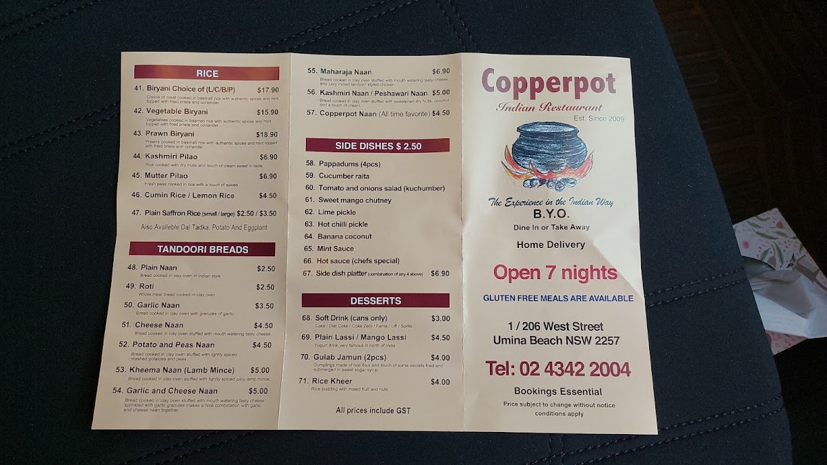 From a reviewer’s perspective, the menu at Copperpot Indian Restaurant offers a well-rounded and thoughtfully curated journey through classic Indian cuisine, clearly reflecting both variety and balance. The Entrée selection sets the tone with crowd-pleasers such as Vegetable Samosa - 2 Pieces, Onion Bhaji, Salt & Pepper Squid, Potato & Corn Tikka, and the indulgent Maharaja Naan, while the Entrée From the Tandoor highlights smoky, charred flavours with dishes like Lamb Cutlets - 4 Pieces, Tandoori Chicken, Seekh Kebab, Chicken Tikka, and the generous Mixed Platter.
